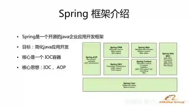 Spring是一个开源的Java企业应用开发框架,其诞生的目标就是简化Java应用开发。下图中是早期Spring版本的模块图,可以看到Spring框架的基座是Spring Core模块,其支撑了Spring的上层模块AOP、DAO、ORM等,而Spring Core的核心就是IOC容器。其实整个Spring框架的核心主要有两个:IOC和AOP。