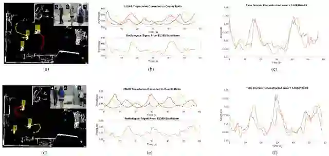 红色和黄色表示携带辐射源的人。(a、d)激光雷达数据的二维表示图像。(b、e)每个人的距离图和辐射数据图。(c,f)辐射信号(橙色)和重建信号(灰色)图。