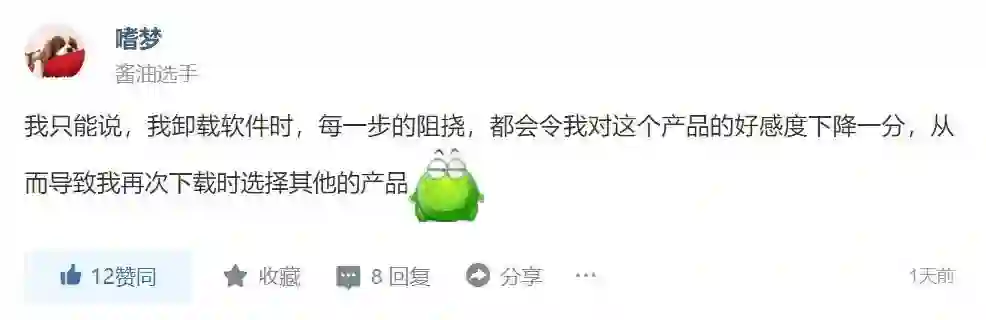 一名网友在回答这个问题的时候表示:“卸载软件时,每一步的阻挠,都会令我对这个产品的好感度下降一分,从而导致我再次下载时选择其他的产品。”,对于这个回复,很多网友表示赞同。