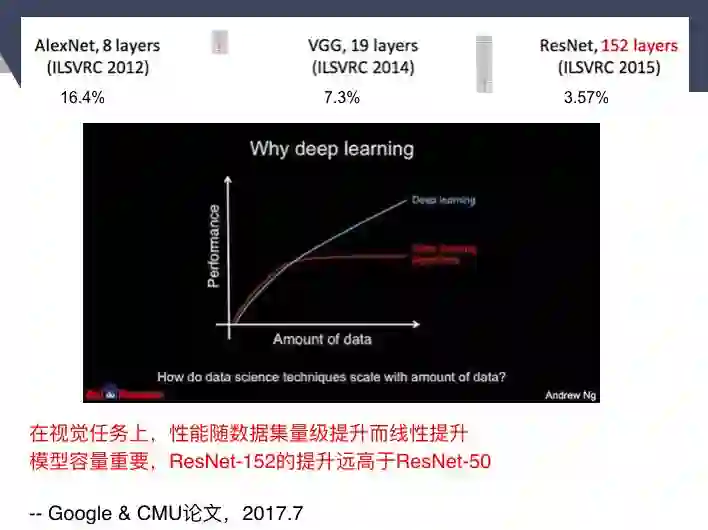 谷歌去年发表的一篇论文结果显示,在视觉任务上,性能随数据集的量级提升而线性提升。同时,模型容量也很重要,数据量越大,对模型复杂度要求越高,模型复杂度越高,它的提升越有效,这也就是为什么ResNet-152的提升远高于ResNet-50。