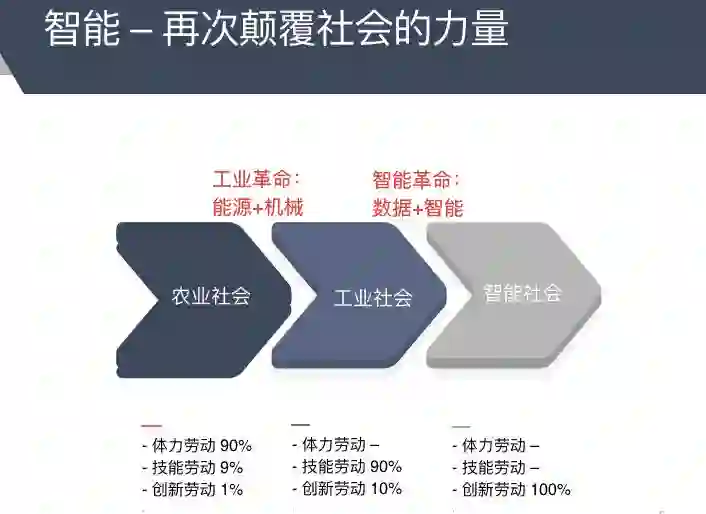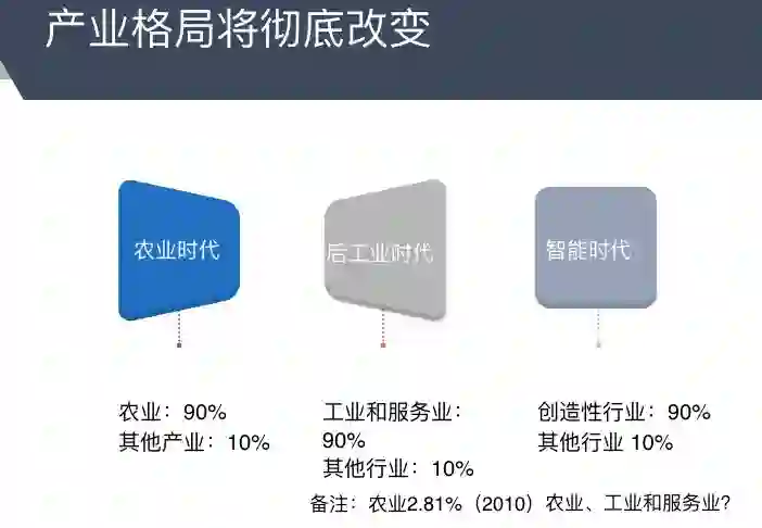 两百年前,最大的产业农业在2010年占GDP的比重仅有2.81%,在智能社会我们可以大胆想象,基于人工智能和创造性的产业占比将达到90%,因此这个社会的财富会再一次被分配,中间的机会非常之多,只有静止不动的企业和静止不动的个人一定会被时代淘汰。