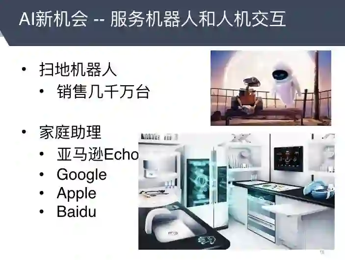 新机会很多情况下是“无中生有”的机会,而服务机器人和人机交互就是这样的机会。以家庭助理机器人为例,这个东西它以前不存在,人工智能的出现让人们拥有了个人秘书,产业机会巨大,因此,谷歌、苹果、亚马逊、阿里、百度等巨头都在做智能助理。