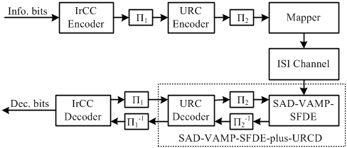 研究人员提出一种由半自适应阻尼(SAD, semi-adaptive damping)调节的向量近似消息传递频域软均衡器(VAMP-SFDE, vector approximate message passing-based soft frequency-domain equalizers),在低信噪比情况下,该均衡器可基于一定先验信息利用快速傅里叶变换以准线性复杂度完全消除符号间干扰。之后,研究人员基于均衡器的外部互信息转移(EXIT, extrinsic information transfer)曲线进行了内码与外码的设计与优化。内码引入单位速率码(URC, unity-rate code)形成有记忆映射以消除迭代译码的错误平层;外码设计为不规则卷积码(IrCC, irregular convolutional code),通过多分量码加权组合来匹配均衡器与内码级联的EXIT曲线,有效降低了迭代信噪比门限。最终,在接收端实现SAD-VAMP-SFDE、URC译码器、IrCC译码器的三阶turbo迭代处理。