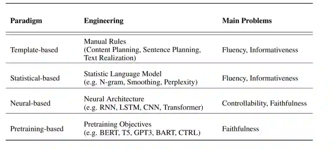 Neural-based。随着深度学习的发展,基于神经网络的端到端方法逐渐占据主导地位,通过端到端训练可以更好地建模词汇与上下文之间的统计共现关系,从而显著提高文本生成性能。NLG已经探索了各种神经结构,如循环神经网络(RNN) (Graves, 2013; Zaremba et al., 2014),卷积神经网络(CNN) (Kalchbrenner et al., 2014)和自注意力Transformer网络(Vaswani et al., 2017)。