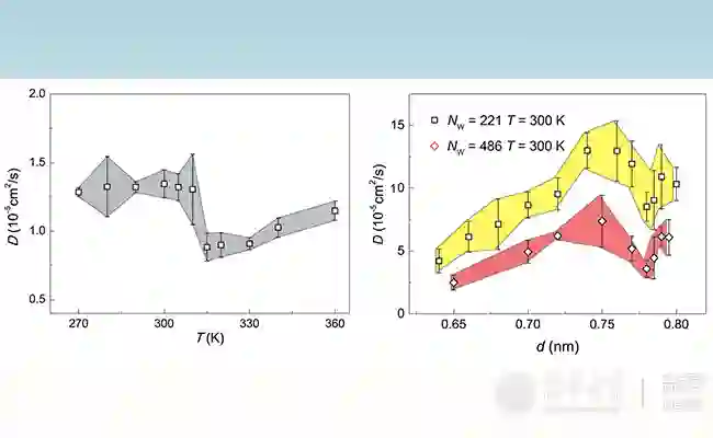 徐志平研究组通过分子模拟技术研究了石墨烯和氧化石墨烯层间受限水插层的自扩散与集体扩散行为。论文研究指出,由于纳米尺度的空间限制,水分子的团簇具有层状结构;而当水分子受限于具有晶体结构的石墨烯壁间时,甚至会在室温形成一定的晶体结构,即二维冰。与流体相比,固体具有一定的剪切刚度,且水分子在其中难以扩散,因此处于石墨烯层间的纳米空间受限水自扩散系数要低于体相水;然而由于石墨烯壁面极低的摩擦系数,水分子的团簇可以在石墨层间实现较体相水自扩散快得多的集体扩散,其扩散系数随团簇尺寸的减小增加,且随温度升高而增大,这是其热激活扩散机制的体现。