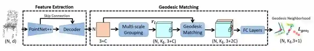 本文通过训练 GeoNet 学习上述定义的函数 f。它包含一个带有跳跃式连接(skip connections)的自动编码器层,以及一个多尺度的测地匹配层(GM),起到利用点集潜在的空间特征的作用。