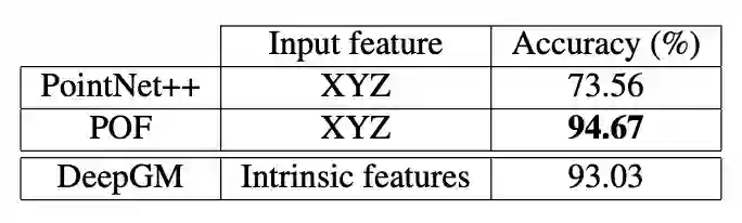 非刚性形状分类的实验结果如表 6 所示。尽管 POF 和 PointNet++ 只把欧式坐标系的点云作为输入,DeepGM 需要在 groudtruth 测地度量空间中利用精确网格数据获取线下计算的固有特征。尽管所用数据信息量更少,但 POF 相较其他方法精度更高。