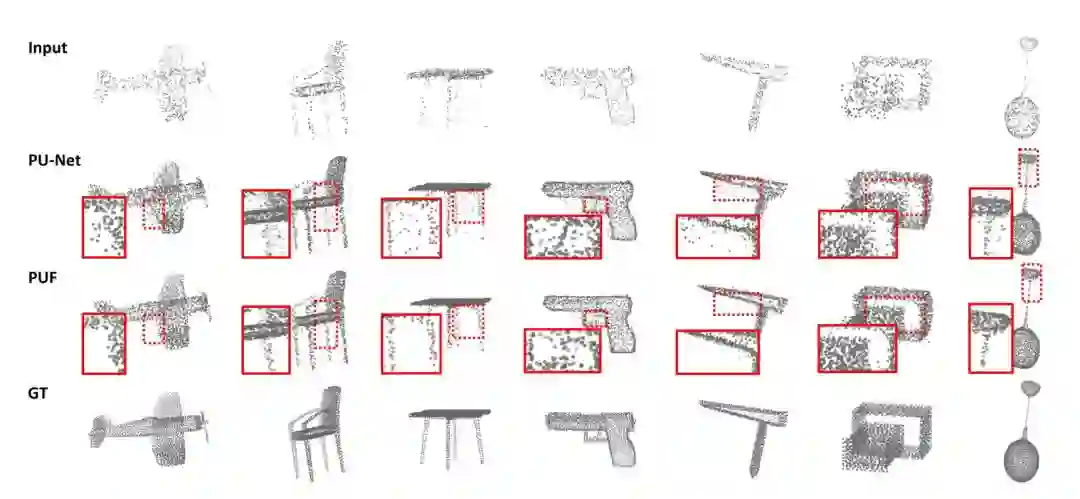 ▲ 图 5:PUF 与 PU-Net 的点云上采样结果对比。