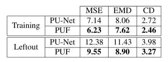 本文在点云上采样任务重测试 PUF,结果如表 3 所示。本文在 3 个指标上与当前最优的点云上采样方法 PU-Net 进行了对比:MSE、EMD 以及倒角距离 CD(Chamfer Distance)。