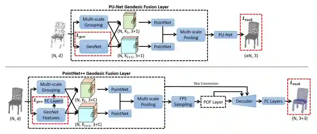 ▲ 图 3:PU-Net(上)和 PointNet++(下)测地融合方案。