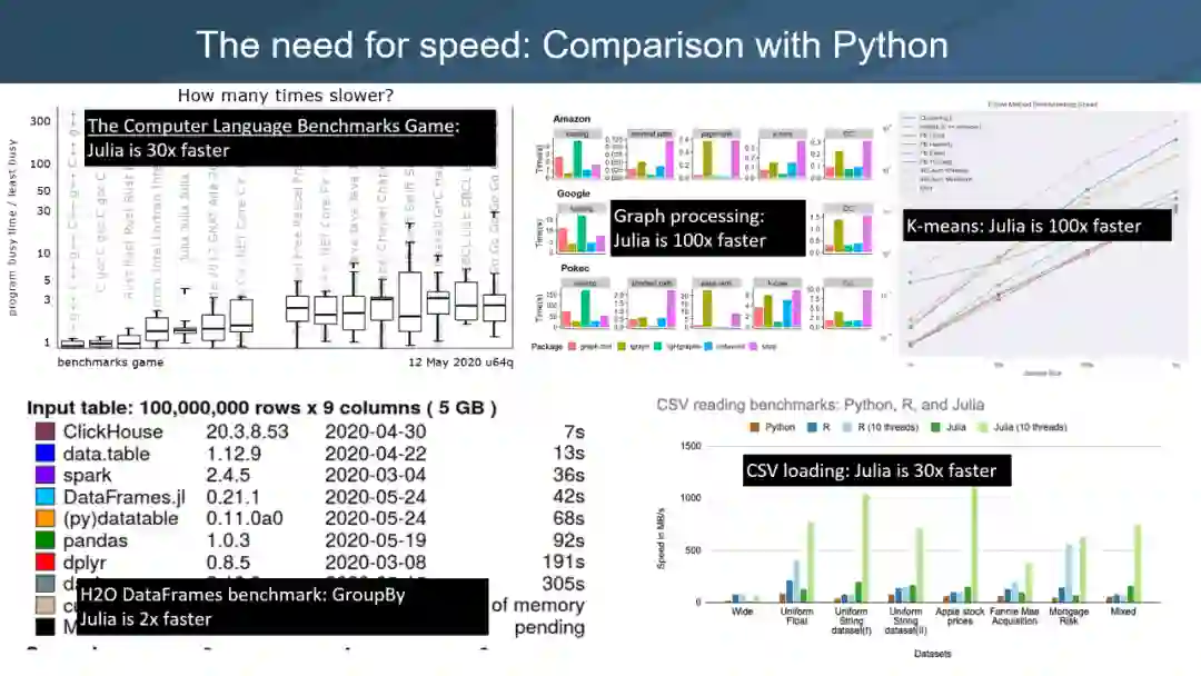 Debian Project 的一项基准测试表明,Julia 的速度可以达到 Python 的 30 倍。尤其在面对大量数据时,Julia 可以使用多线程,实现快速的数据加载。随着社区的不断壮大,Julia 的生态也在不断丰富,目前已经拥有 3000 多个开源包。