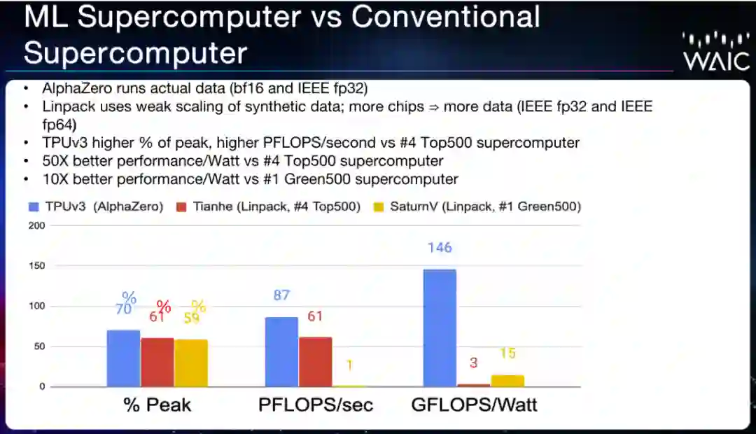 那么,这些芯片构建的超级计算机的性能如何呢?与传统超算相比,TPU v3 的性能 / Watt 是 TOP500 超算排行榜中第四名「天河」的 50 倍,是 Green500 超算排行榜第一名 SaturnV 的 10 倍(注:David Patterson 此处引用的是 2019 年的 TOP500、Green500 数据)。