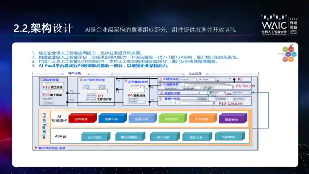 中国建设银行总行金融科技部总工程师胡宪忠表示,将人工智能视角的企业级结构 6 层次设计集成到原有的企业架构中,才能实现建行的人工智能即服务(AIaaS)目标。而 AI 是企业级架构的重要组成部分。