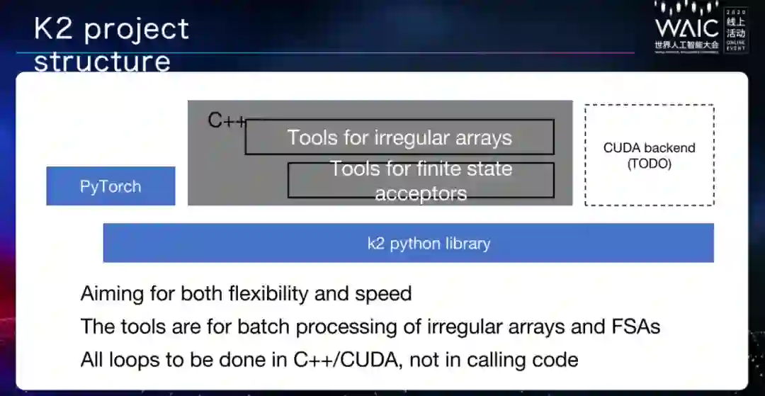 如上图所示,K2 是一个 Python 库,可与 PyTorch 兼容,拥有两个后端,一个是 C++,另一个是用于 GPU 的 CUDA 后端。PyTorch 可以高效处理矩形张量,但是不适合处理不规则数组,而 K2 项目旨在利用多种工具处理不同类型的数据,提高速度和灵活性。