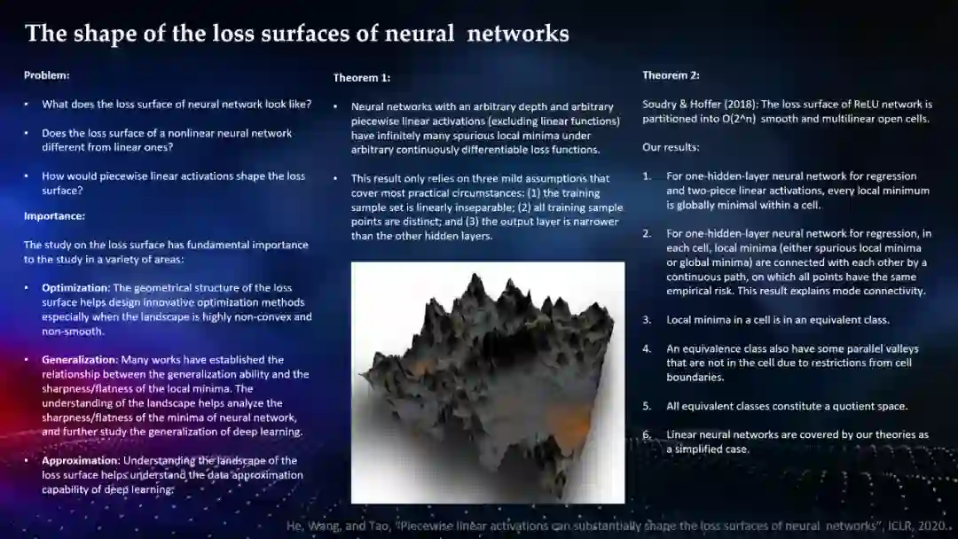 2018 年,Soudry 和 Hoffer 证明任意深度的带有分段线性函数(不包括线性函数)的神经网络的损失平面可划分为多个平滑且多线性的开放单元。尽管其边界不可微分,但 n 层神经网络的单元数量在 2^n 数量级上。