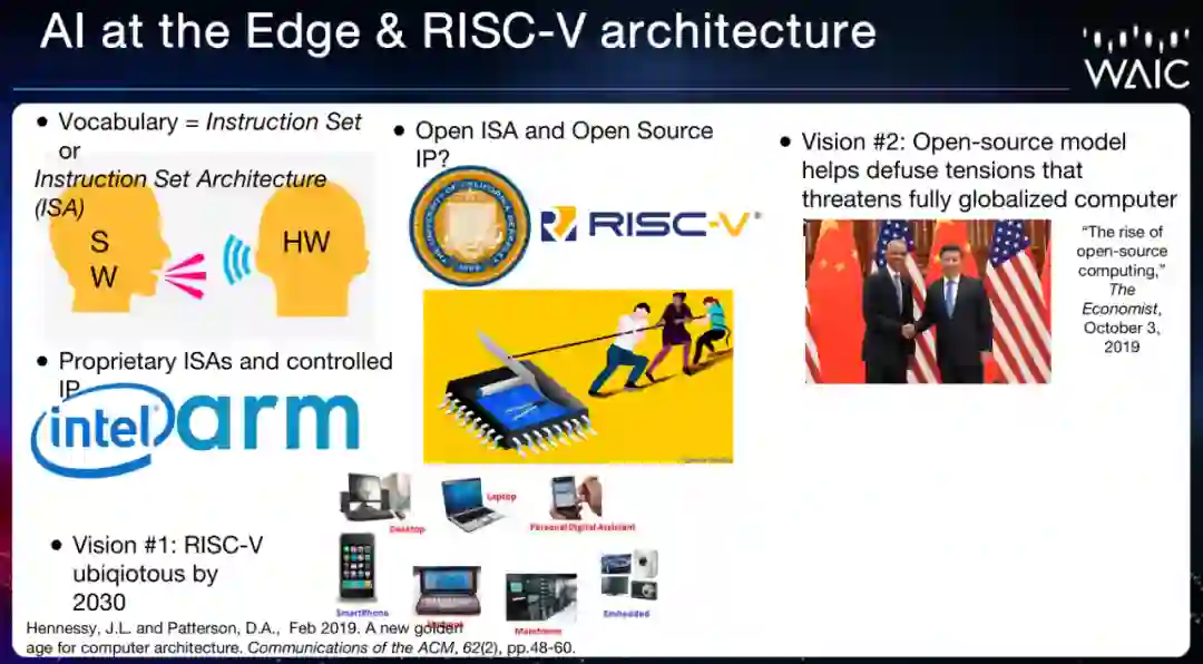 以适用于边缘计算设备的阿里平头哥玄铁 910 芯片和初创公司 OURS 开发的 Pygmy 芯片为例,David Patterson 介绍了 RISC-V 架构在边缘计算芯片中的作用。