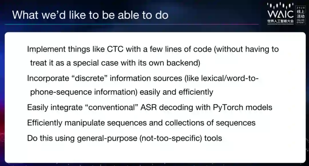 在 WAIC 开发者日上,Daniel 介绍了开发新一代 Kaldi 的思路、时间线和进度。