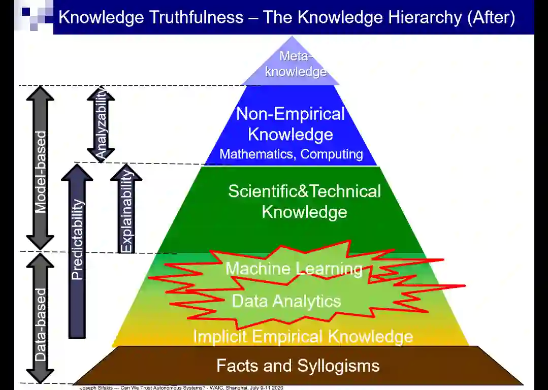 那么知识如何分类呢?Sifakis 将知识分为了事实和推论、隐含的经验知识、科学和技术知识、非经验知识(如数学和计算机知识)和元知识(知识的知识)。但随着机器学习和数据分析的引入,知识的分类相应地发生了变化,具体分类如下图所示: