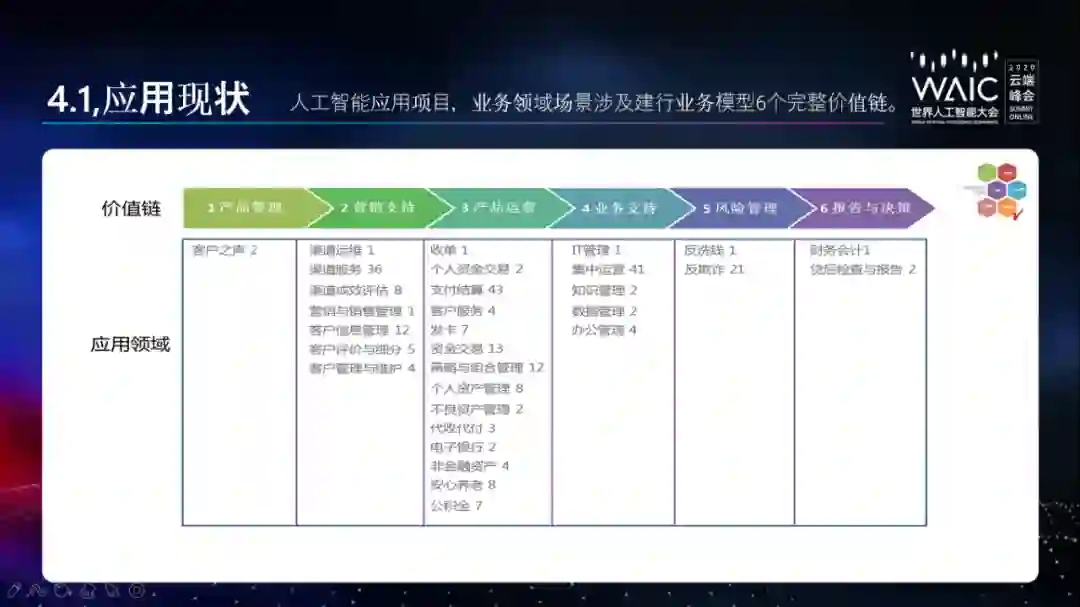 在讲述人工智能应用场景时,胡宪忠称业务领域场景已经涉及建行业务模型 6 个完整价值链,贯穿产品管理、营销支持、产品运营、业务支持、风险管理和报告与决策。
