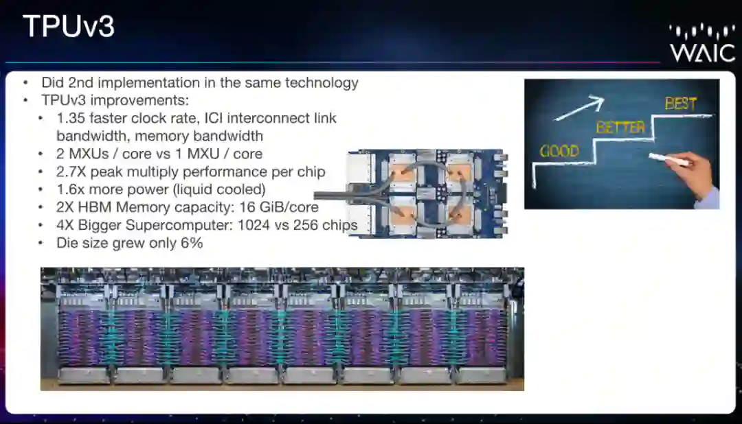 David Patterson 在演讲中介绍了谷歌为云端开发的 TPU 系列芯片,以及当前 v3 版本的卓越性能。