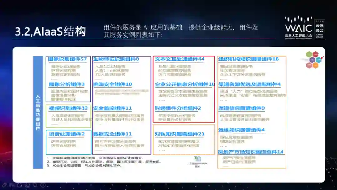 紧接着,胡宪忠介绍了 AIaaS 结构。其中,AI 功能组件分为 6 大类,分别是图像识别类、智能安全类、自然语言处理类、视频识别类、语音识别类和知识图谱类。这些 AI 功能组件旨在提升企业的智能化能力,提供服务目录供应用组件和应用调用。