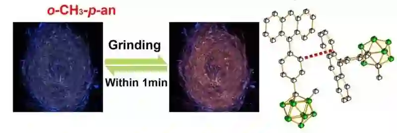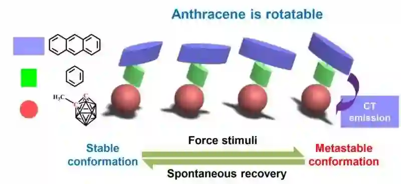 燕红课题组首先关注力致变色材料,因其对外界力的刺激做出响应可用在压力传感、光学信息存储等领。通常该性质用于非易失性存储器,然而固态下较强的分子间相互作用导致易失性存储器难以实现。该课题组将碳硼烷基元引入到蒽发光团形成“D-p-A”构型发光分子,实现了此类自修复力致变色材料(Chem. Commun. DOI: 10.1039/c6cc07093k)。研究发现碳硼烷的存在使得化合物可以通过力调控固态分子内电荷转移实现力致变色响应,该响应还可在1分钟内完成自修复恢复到原始状态(图1),具有易失性存储器需要的性能,显示出潜在应用前景。