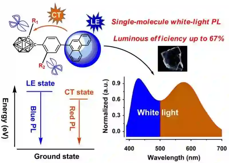 受以上碳硼烷化合物在固态下具有多重发射特征的启发,该课题组认为通过合理设计,应该可以实现该类单一有机化合物固态下的白光发射!当前用于照明及显示的白光器件主要通过互补色或三基色来实现,但遭遇色彩重复性难及制备工艺繁杂等问题。另外,由于难以精确调控分子的激发态,加之固态下分子通常表现出聚集淬灭效应,宽的发射光谱,高效的有机单分子白光材料目前报道很少。针对这一科学问题,燕红课题组通过优化供体单元在制备简单、具有较高热稳定性(分解温度360oC)的碳硼烷基菲类分子中实现了固态白光发射(图2),通过分子结构剪裁使得化合物晶体结构由H-聚集体向J-聚集体和交叉堆积转变,其白光绝对量子效率可达到67%,这是目前单分子有机白光材料中最高值,该研究成果发表在Angew. Chem. Int. Ed. DOI:10.1002/anie.201703862。