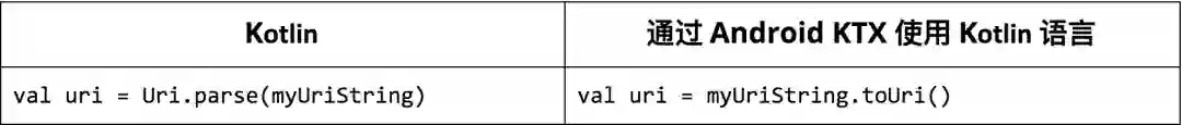 我们先举个简单的例子。一般来说,您需要通过调用 Uri.parse(uriString) 进行 URI 和字符串之间的转换;而 Android KTX 则通过给字符串类添加扩展功能让您更为自然地将 URI 转化为字符串。