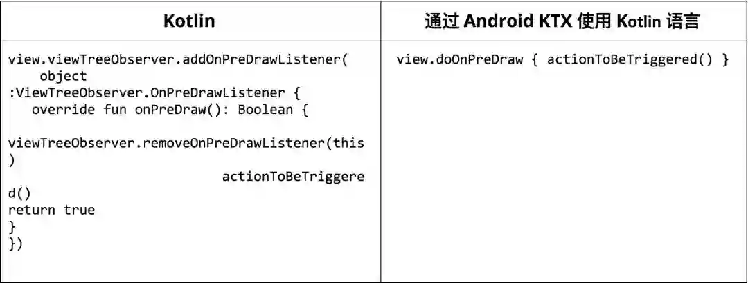 下例演示了在视图 (View) 中的 onPreDraw 回调函数执行其他任务 (Action)。若不使用 Android KTX,开发者须编写更多代码。