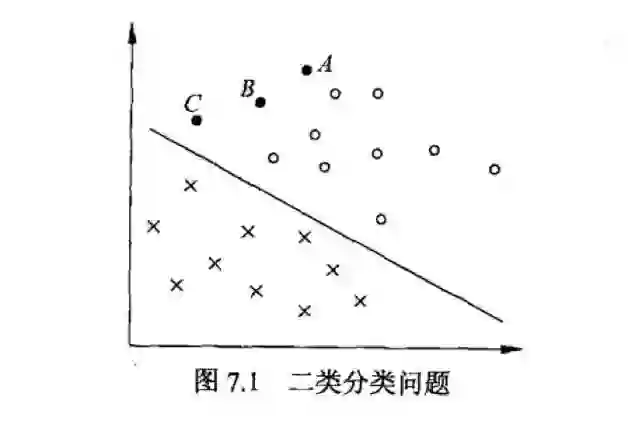 上图中,X表示负例,O表示正例。此时的训练数据可分,线性可分支持向量机对应着将两类数据正确划分并且间隔最大的直线。