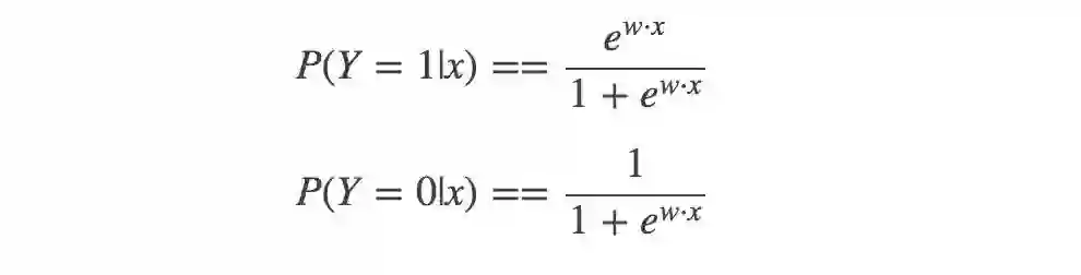 然后,二分类LR模型,是参数化的logistic分布,使用条件概率来表示: