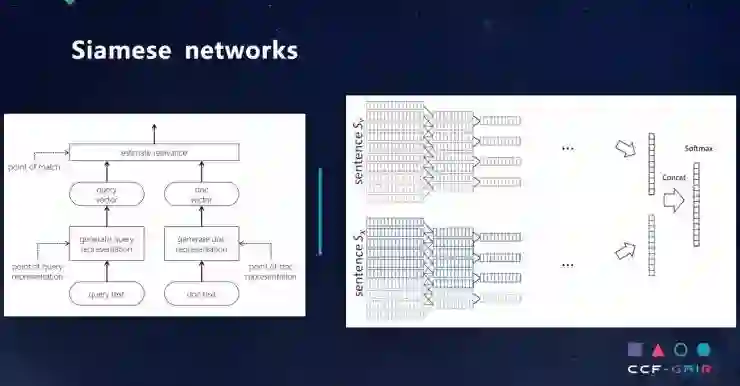 像 CNN 的 ARC-1 就是 Siamese 网络典型的例子,Siamese 网络比较直观,它的想法很简单,把两个输入用同样的编码器做一个表达,把表达做出来以后,可以用一个模块来做相似度的计算,它的特点是共享网络结构和参数。右边是具体的实现,可以用 CNN 实现 Encoder。