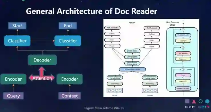 下面是一般的 Doc Reader 框架。这几年阅读理解框架非常火,也有很多相关工作。下图右所示是谷歌最近得分最高的一个单模型 QANet,可以看到,首先会有一些 Encoder,把用户的问题都读取进来,它的核心在 Attention,可以设置很多 Attention 机制,比如基于字、基于短语,或基于时刻、步长的 Attention。Attention 是一个很大的舞台,可以尝试很多方法。当拿到问题和文档交互的内容信息,送到 Decoder 部分,来生成文档在文章中的位置。所以这是一个分类问题,即这个词是不是这个档案的开头,另外是找结尾,看这个词是不是档案的结尾。这是一个比较通用的框架。