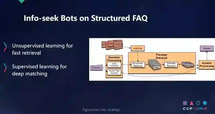 他重点描述了第二种类型,即如何让问答系统解决用户的信息获取类问题。围绕这一类型,他讲解了智能问答系统的基础架构,以及非监督学习和监督学习在这里所起的作用。