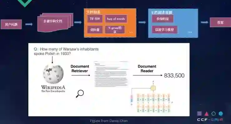 实际上我们离真正做阅读理解还存在差异,我们在业界做阅读理解时,首先要做召回,因为不知道哪篇文章里包含了问题的答案。这里先要快速去做检索,做完检索才到下一个部分——文档阅读理解模块。文档阅读理解并不是这两年才发展起来的,很多年前就有相关工作了,以前是基于传统特征,比如说基于三元组的关系抽取的方法,现在更多想用一些深度模型的方法来做阅读理解。