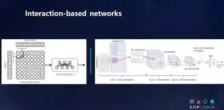 基于交互矩阵的网络的不同之处在于,除了最终表达相关性度量时,中间某些词可能会有更强的交互,特别是在文档很长的时候。这一类型的网络和 Siamese 网络相比,在两个问句很短的时候打成平手,但是如果问题很长,包含了很多的内容,里面有一些关键信息,这一网络就会有更好的表现,当我们做好表达以后,会看这个表达里面每一个小的词组之间交互的情况。