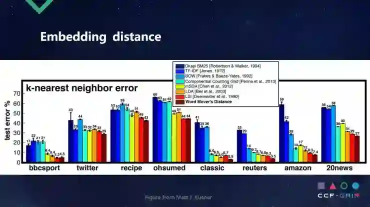 从下图可以看到 WMD 的效果,在几个评测里,它的错误率相对来说比较低,比其他方法低了将近十几、二十个百分点。它的实际效果确实不错,但是算法复杂度比较高,因为需要全部做两两比较来计算,所以耗时会长一点。我们一个很大的要求是快,对 WMD 有一些扩展研究,有兴趣的同学可以继续关注后面的一些工作。