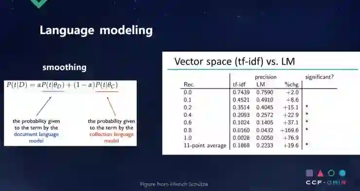 不同平滑的方法对应不同的语言模型。从实践角度来看,TF-IDF 和语言模型比较,语言模型有比较大的提升,可以看到图右几项比较里有五项取得显著提升。