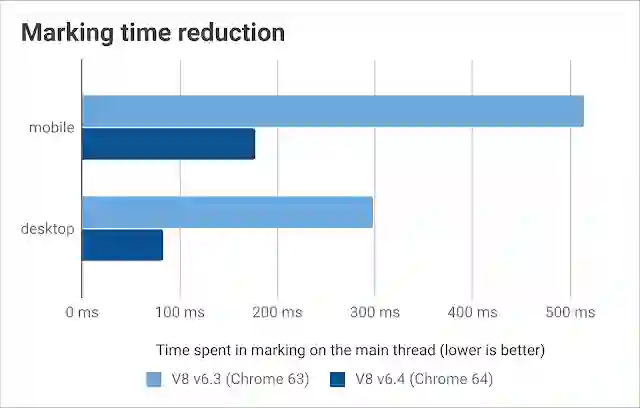 测试结果显示移动和桌面上每个 GC 周期的主线程标记时间分别减少了 65%和 70%。