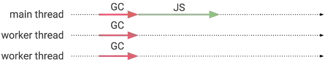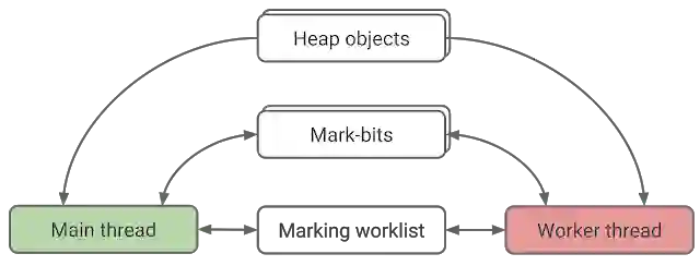 当工作线程正访问堆内存上的对象时,并发标记允许 JavaScript 在主线程上运行,这为许多潜在的数据竞争(data races) 打开了大门。例如,当工作线程正在读取字段时,JavaScript 可能正在写入对象字段。数据竞争可能会让 GC 错误地释放活动对象或将原始值与指针混合在一起。