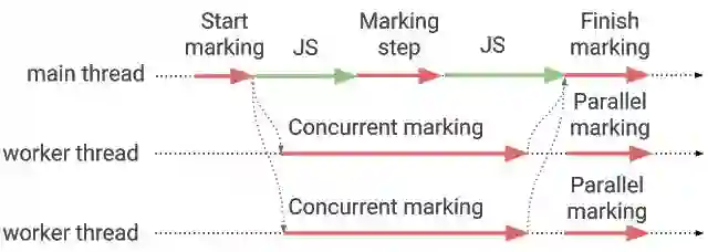 由于 write-barrier 会有消耗,增量标记可能会降低应用程序的吞吐量。通过使用额外的 worker threads 可以提高吞吐量和暂停时间。有两种方法可以在 worker threads 上进行标记:平行标记(parallel marking)和并发标记(concurrent marking)。