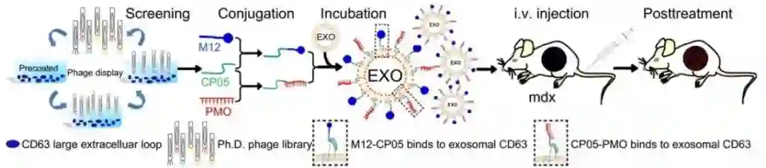 外泌体是大分子的循环纳米载体,越来越多地用于诊断和治疗。在不改变外泌体表面的情况下修饰患者来源的外泌体的能力是其治疗潜力开发的关键。来自天津医科大学的尹海芳研究团队证明通过噬菌体展示鉴定的肽(CP05)通过结合外泌体表面蛋白CD63使得不同来源的外泌体(包括患者来源的外泌体)靶向、装载和捕获外泌体成为可能。与CP05-PMO相比,装有CP05修饰的肌营养不良蛋白剪接校正磷酸二酰胺吗啉寡聚物(EXOPMO)的外泌体的系统性施用使得肌营养不良蛋白缺乏的mdx小鼠肌养蛋白增加18倍。在EXOPMO上加载CP05-肌肉靶向肽进一步增加了肌肉中的肌养蛋白表达,其功能改善没有任何可检测到的毒性。该研究研究表明,外泌体锚肽能够直接、有效地功能化和捕获外泌体,从而为外泌体工程化,探索体内基因功能和靶向治疗药物递送提供工具。