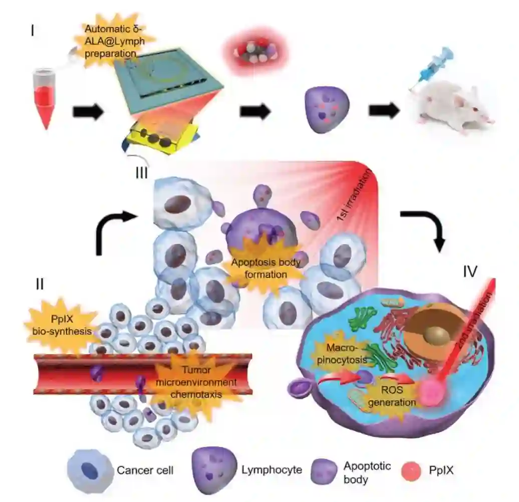 细胞疗法已经在癌症治疗领域受到相当大的关注,并且已经应用各种化学或遗传方法来重塑天然细胞以改善细胞疗法的治疗结果。这里报道了一种通过使用临床使用的分子δ-氨基乙酰丙酸(δ-ALA)修饰淋巴细胞以进行癌症治疗的简单方法。在与该分子温育后,靶向肿瘤的淋巴细胞自发合成抗肿瘤药物原卟啉X(PpIX),并特异性积聚在癌组织中。在定期的630 nm激光照射下,淋巴细胞产生含有PpIX的囊泡样凋亡小体(Ab),促进Ab输送PpIX,在第二次照射下对Ras突变的癌细胞具有优异的治疗效果。重要的是,该研究进一步设计了微流体装置以通过一步操作来简化细胞分选和药物合成,这可以促进该策略的普遍化。体外和体内研究证实了这种易于操作和全面调节的癌症治疗策略的效果。