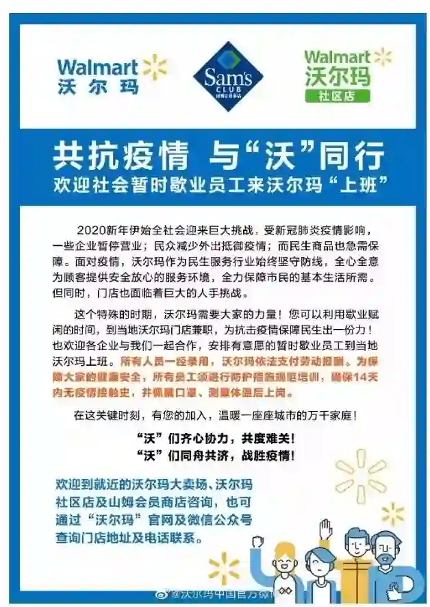 2月4日,生鲜传奇、沃尔玛、金虎便利等多家公司相继发出了“共享员工”的邀请,欢迎暂时歇业的员工前去“上班”。