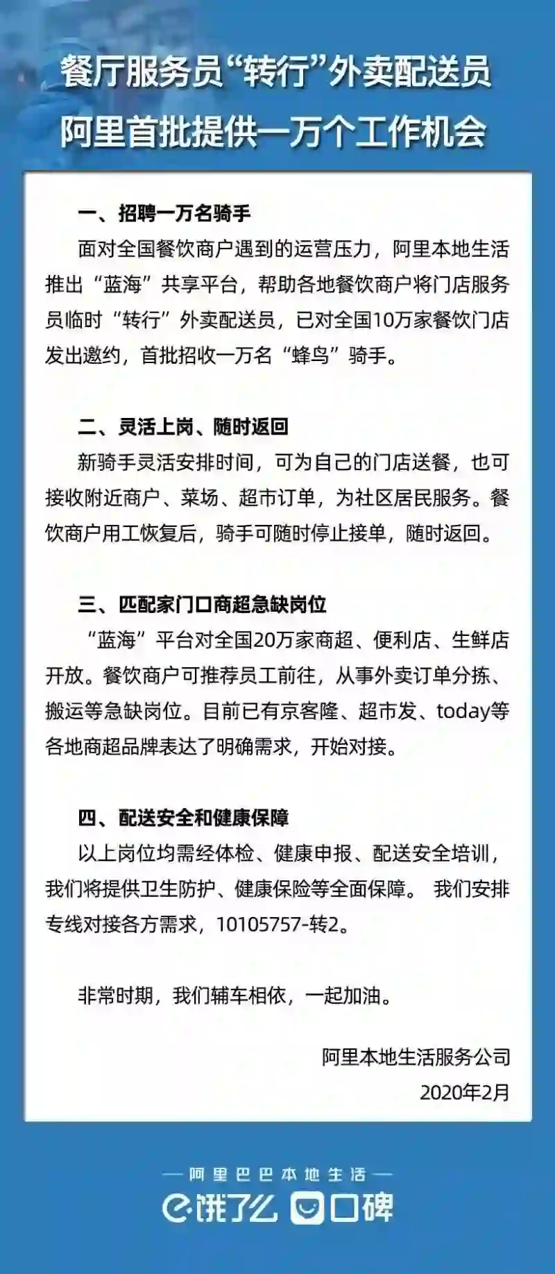 2月6日,阿里本地生活服务公司推出“蓝海”就业共享平台,餐饮商户可以通过该平台推荐员工报名成为“蜂鸟”骑手。新骑手灵活安排时间接单,也可为自己的门店送餐,商户用工恢复后可随时停止接单,随时返回。“蓝海”计划第一批招收1万名“蜂鸟”骑手,即饿了么小哥。