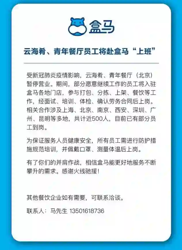 2月3日,盒马宣布联合云海肴、青年餐厅等餐饮企业,合作解决现阶段餐饮行业待岗人员的收入问题,缓解餐饮企业成本压力,和商超生活消费行业人力不足的挑战。