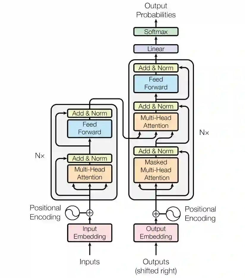 如上所示,左侧为输入序列的编码器。输入序列首先会转换为词嵌入向量,在与位置编码向量相加后可作为 Multi-Head Attention 模块的输入,该模块的输出在与输入相加后将投入层级归一化函数,得出的输出在馈送到全连接层后可得出编码器模块的输出。这样相同的 6 个编码器模块(N=6)可构成整个编码器架构。解码器模块首先同样构建了一个自注意力模块,然后再结合编码器的输出实现 Multi-Head Attention,最后投入全连接网络并输出预测词概率。