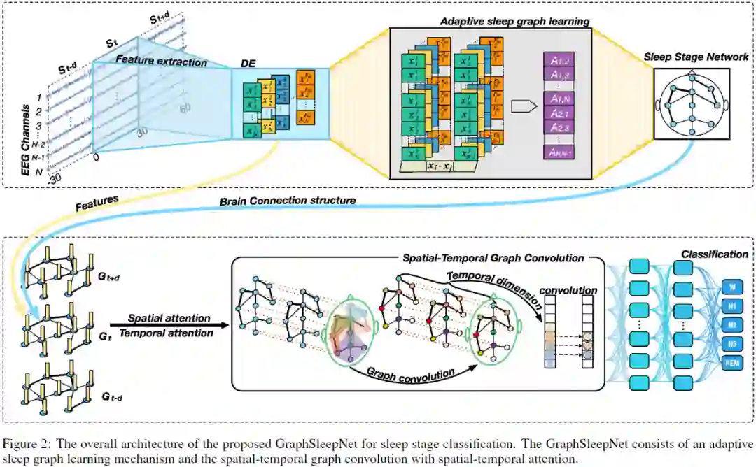 GraphSleepNet 的总体架构如图 2 所示。我们总结了本文模型的三大关键点:
