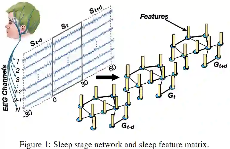 基于图卷积神经网络在图结构数据中的成功应用,我们采用图结构表示方法研究睡眠分期问题,在多导 EEG 数据中,每个 EEG 通道对应于睡眠图中的一个节点,两个节点之间的连接对应于睡眠图中存在的边。