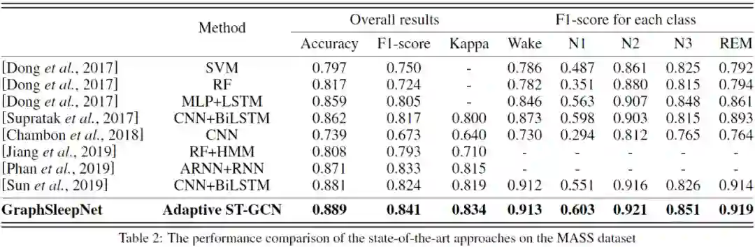 我们在 Montreal Archive of Sleep Studies(MASS)-SS3 数据集上评估了我们提出的模型。MASS-SS3 数据集包含来自 62 名健康受试者(28 名男性和 34 名女性)的 PSG 记录。每次记录包含 20 导 EEG、2 导 EOG、3 导 EMG 和 1 导 ECG。